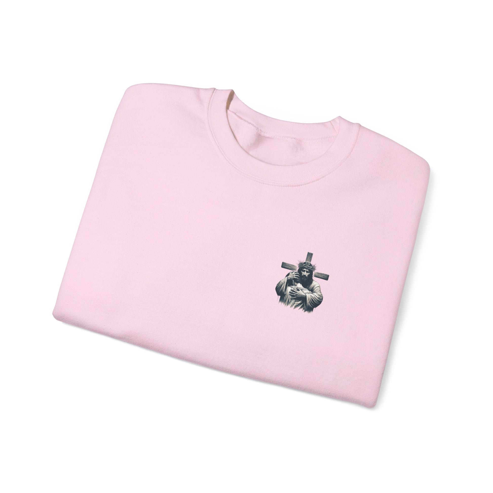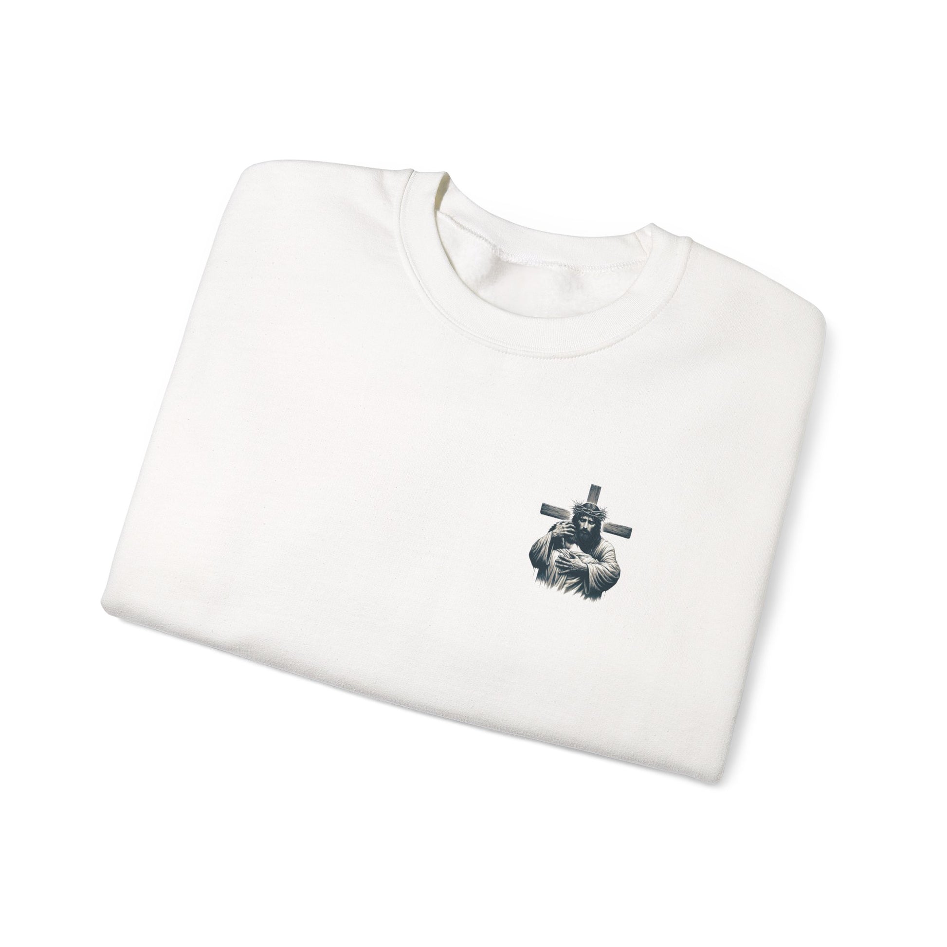 A soft, midweight crewneck sweatshirt printed with reverent religious artwork. The front carries a small, detailed chest print of a crowned, robed Christ figure; the back displays a larger matching portrait beneath the bold heading “Isaiah 41:10” and a subtle block of microtext beneath. The fabric has a gentle, broken-in feel and clean lines thanks to tubular knit construction and ribbed collar. It wears like a familiar favorite — warm without bulk, quiet in white so the artwork and scripture stand out. This sweatshirt sits well over a tee or under a jacket for church evenings, small group meetups, or quiet mornings of reflection.